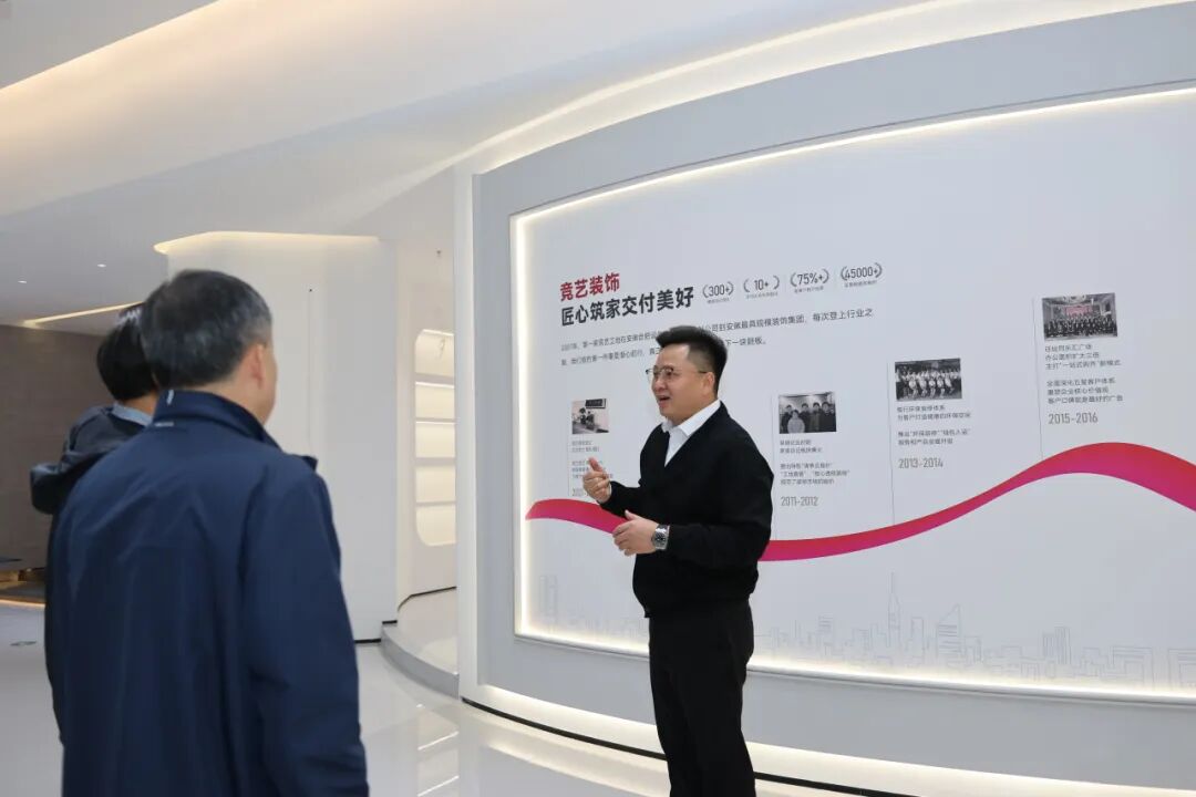 竞艺装饰新店初启,有幸成为本次会议的召开地。会议结束,在竞艺装饰董事长、市建筑装饰协会副会长、家装专委会秘书长曹世杰的陪同下,城乡建设领域协会(中心)党总支书记戴晓盈、市建筑业协会党支部书记于飞、合肥市建筑装饰协会会长杨超、合肥市建筑装饰协会副会长兼秘书长杨传贤等领导们参观了竞艺装饰新展厅。董事长曹世杰着重为领导们介绍了竞艺18年的发展历程, 以及如何致力打造对员工有温度对客户有价值的企业,得到领导们的一致赞扬。