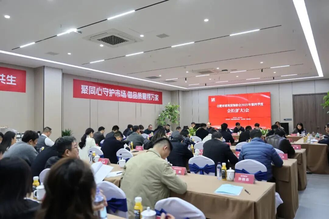 12月2日下午,合肥市建筑装饰协会2025年第四季度会长(扩大)会议在协会副会长单位竞艺装饰集团会议室成功召开。会议特邀市城乡建设领域协会(中心)党总支书记戴晓盈、市建筑业协会党支部书记于飞、市建筑市场监督管理处高级工程师左丽丽出席并讲话,协会会长、副会长、秘书长、监事、各专委会主任及秘书长、副会长单位代表及协会秘书处工作人员近六十人参加会议。会议由合肥市建筑装饰协会会长杨超主持。